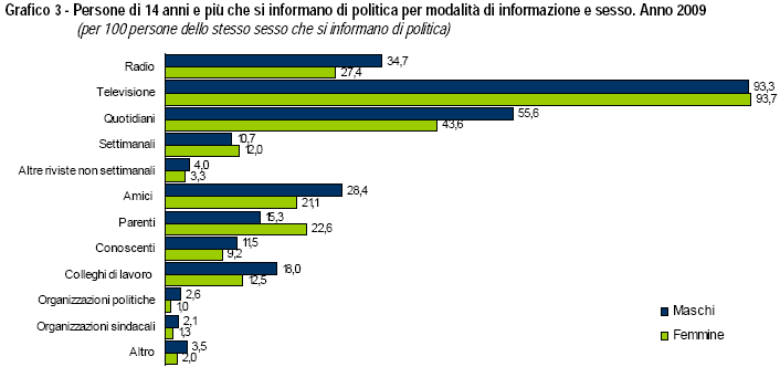 Secondo l’ultima indagine Istat il 23,3% della popolazione di 14 anni e più non si informa mai di politica. Si tratta di quasi 4 milioni di uomini e di 7 milioni 847 mila donne. Il 60,7% delle persone di 14 anni e più si informa almeno una volta a settimana e il 35,9% ogni giorno.