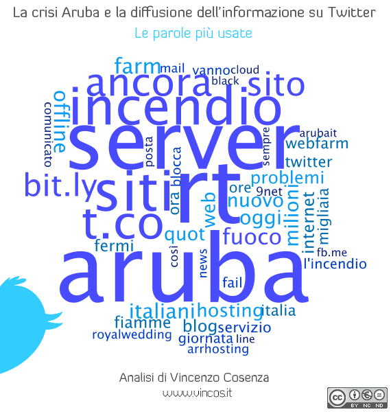 Visto che i media tradizionali ignorano la vicenda, Twitter diventa il luogo privilegiato dove attingere le notizie, magari inventando battute di spirito sul provider aretino per evitare di bestemmiare. In tal senso una delle parole più usate, come si evince dalla mia analisi, è “arrhosting”. Molto alto il numero dei retweet (RT) e l’uso della parola “ancora” visto che il disservizio si è protratto per molte ore.