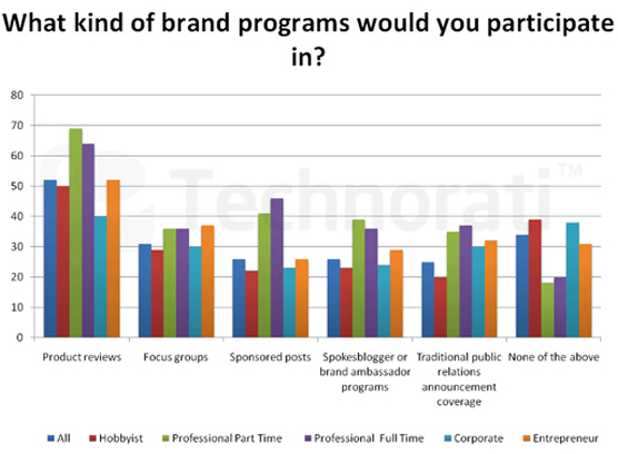 – Motivazioni: il 61% blogga per hobby, il 13% scrive part-time per avere un compenso aggiuntivo, il 5% lo fa come lavoro principale, il 13% restante per promuovere la propria azienda o quella di cui è dipendente;