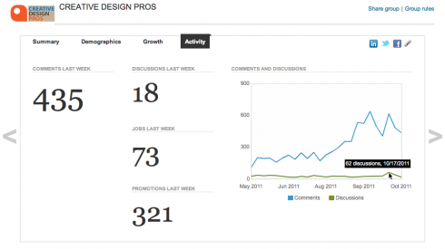 LinkedIn ha recentemente raggiunto 131 milioni di utenti registrati e continua a potenziare le funzioni della piattaforma soprattutto al fine di aumentare il tasso di permanenza e ritorno dei membri. Ieri è toccato ai Gruppi per i quali è stato introdotto un bel cruscotto di analisi, disponibile per tutti, dunque non limitato ai soli amministratori. Al momento è il primo strumento statistico per “forum di discussione” interni ad un social network (i gruppi di Facebook non offrono analytics).