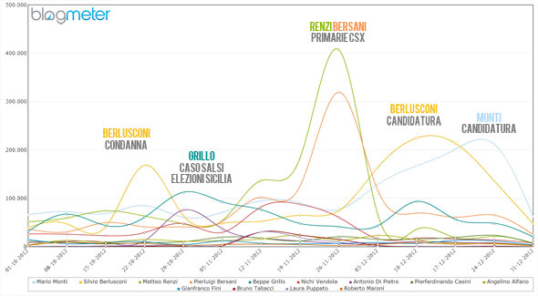 Il politico più citato in rete è stato il presidente del consiglio (oltre 1.400.000 documenti), seguito a ruota da Silvio Berlusconi (oltre 1.350.000), Matteo Renzi (che è stato proattivo nel creare buzz a suo favore), Bersani e Grillo (anch’egli molto presente e aiutato da una community vocal nei confronti delle sue iniziative). Se invece si considerano solo le menzioni sui siti di news emerge un incremento di share of voice di Monti (che passa dal 19% complessivo al 24% anche in virtù del suo ruolo istituzionale) e una perdita di visibilità di Renzi (dal 17% all’11%) e Grillo (dall’11% al 6%).
