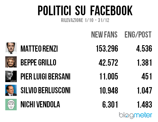 Su Facebook è sempre più forte il capitale sociale accumulato da Beppe Grillo, che veleggia verso il milione di fan, ma colui che ne ha guadagnati di più, nel trimestre conclusivo di quest’anno è Matteo Renzi. Il sindaco brilla anche per capacità di coinvolgimento: ogni suo post, mediamente genera 4.536 reazioni (like, commenti, condivisioni). Sono suoi i tre post politici più apprezzati su Facebook, su tutti quello col quale chiude le porte al cavaliere ottiene 69.668 like, 7.547 commenti e 11.325 condivisioni. Chissà se queste sue capacità, che sono anche di Vendola, verranno messe al servizio di Bersani che, pur guadagnando sostenitori, non riesce a stimolarli efficacemente.