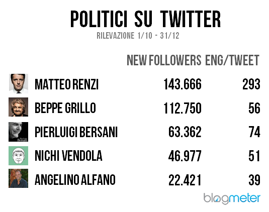 Anche su Twitter Grillo è primo per numero di follower (782.763 al fine 2012) seguito da Renzi, che ha dimostrato una maggiore velocità di accumulazione e anche di engagement. Per ogni tweet ottiene, mediamente, 293 risposte o retweet (c’è da dire che scrive anche di meno rispetto al comico genovese). In generale il suo account è anche più citato del periodo con 214.436 menzioni, seguito da Bersani con 158.429.