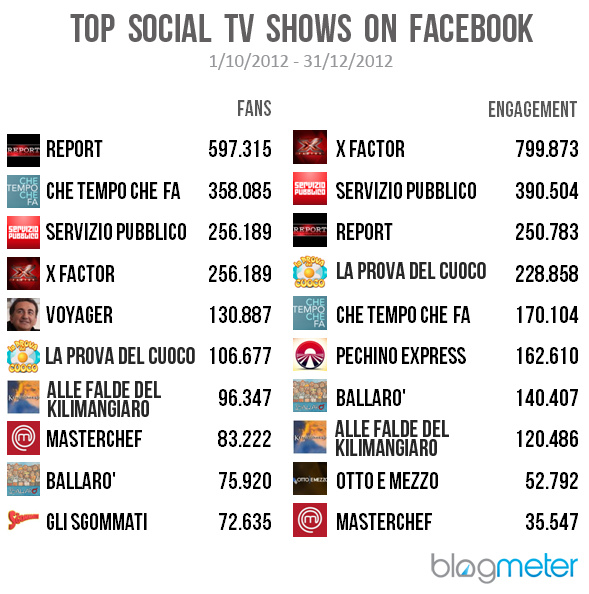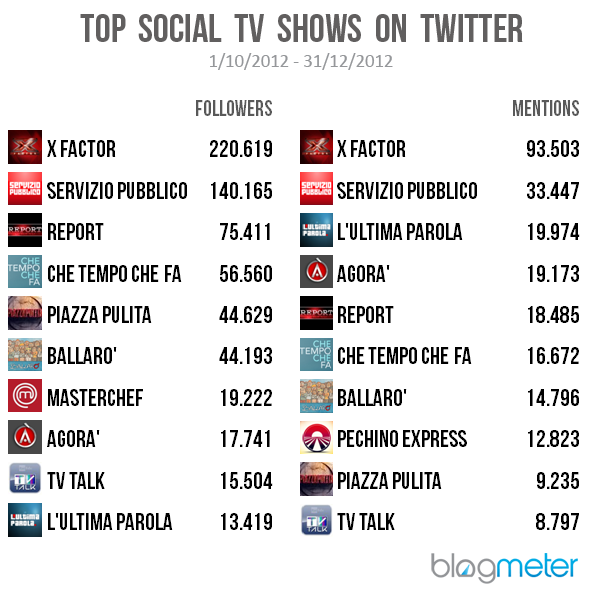 Tra le trasmissioni continuative, invece, le discusse online degli ultimi mesi del 2012 (non abbiamo considerato le fiction e le serie tv) sono state X Factor con 630.391 menzioni solo su Twitter, Servizio Pubblico con oltre 240.000 citazioni su Twitter (di cui 33.447 dirette all’account) e Report che ha generato oltre 70.000 tweet (di cui 18.485 indirizzate all’account ufficiale).
